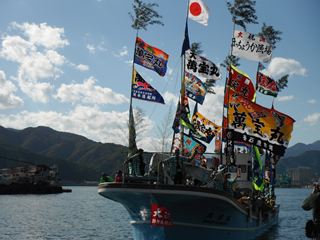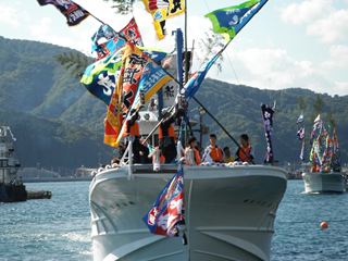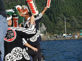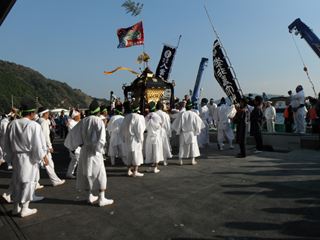 お神輿の乗る船に向かって手を振り、いつまでも見送ります。
