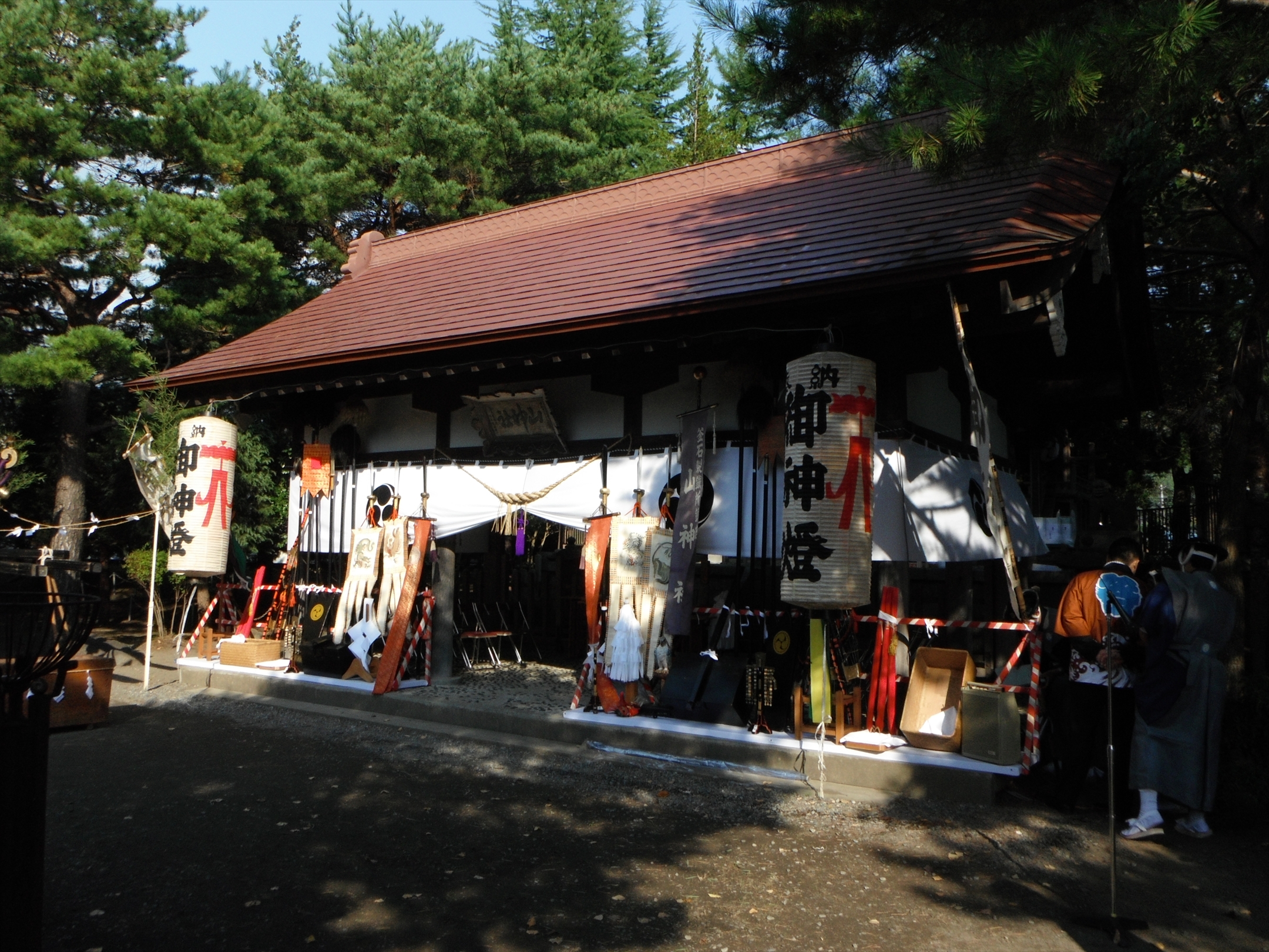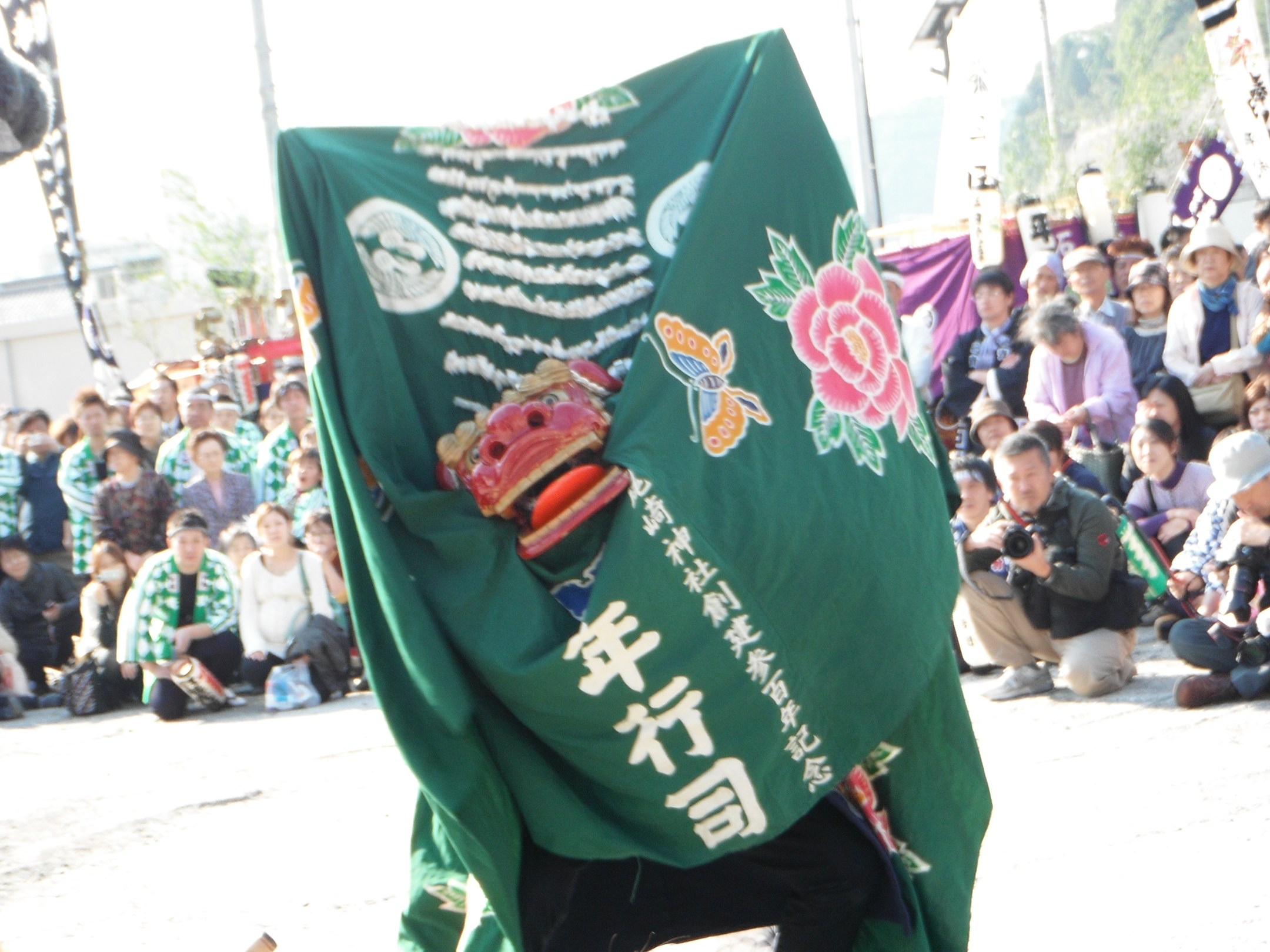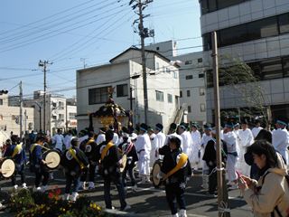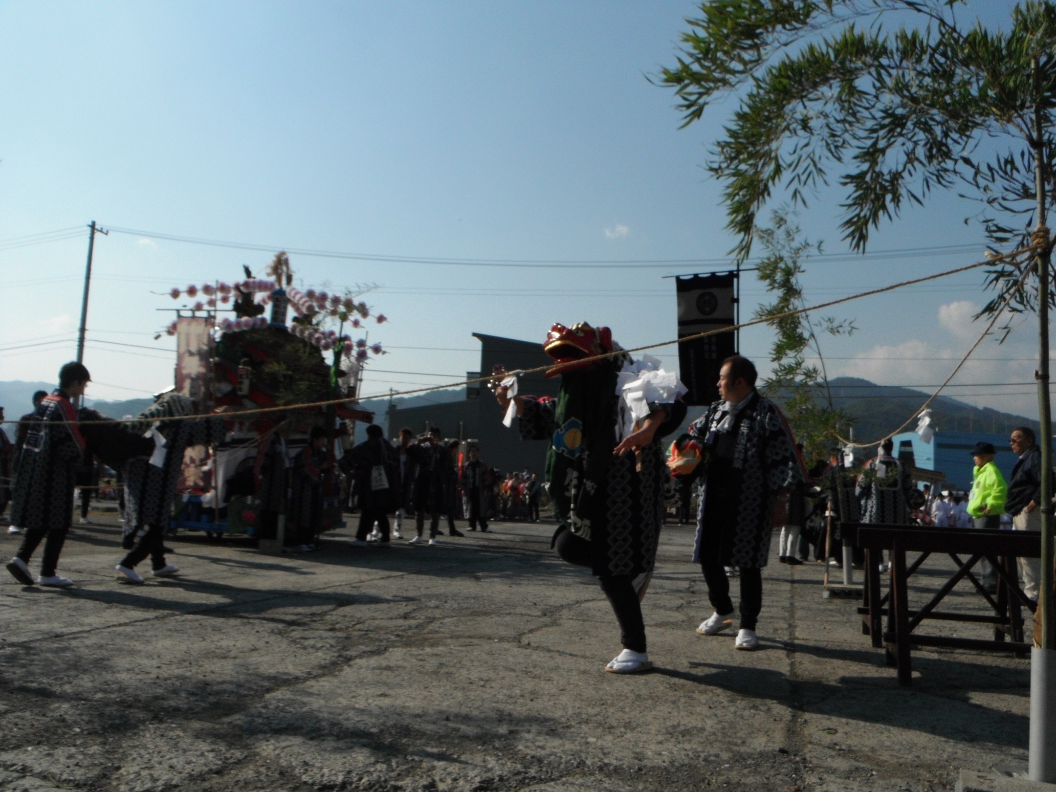 ▼東前の道路には、御神輿さまを待つ、神楽や虎舞が待機しています。