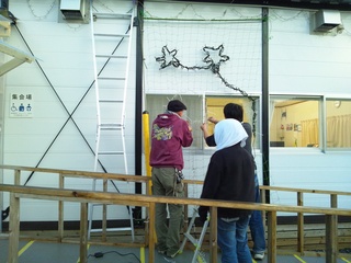 網を利用して、イルミネーション取り付け開始。