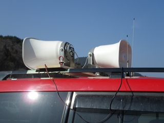 屋外支局:上から防災行政無線スピーカー。すぐ下が防災行政無線アンテナ。そして