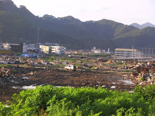 震災後の鵜住居地区です。水が溜まり、家々やお店が並んでいた風景は見事に無くなってしまいました。