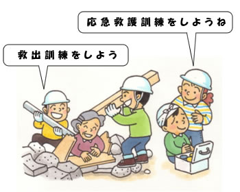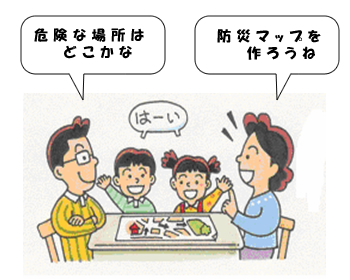 家族の役割分担、離ればなれになった場合の安否確認の方法や集合場所、避難場所や経路、隣近所との協力体制)おこう