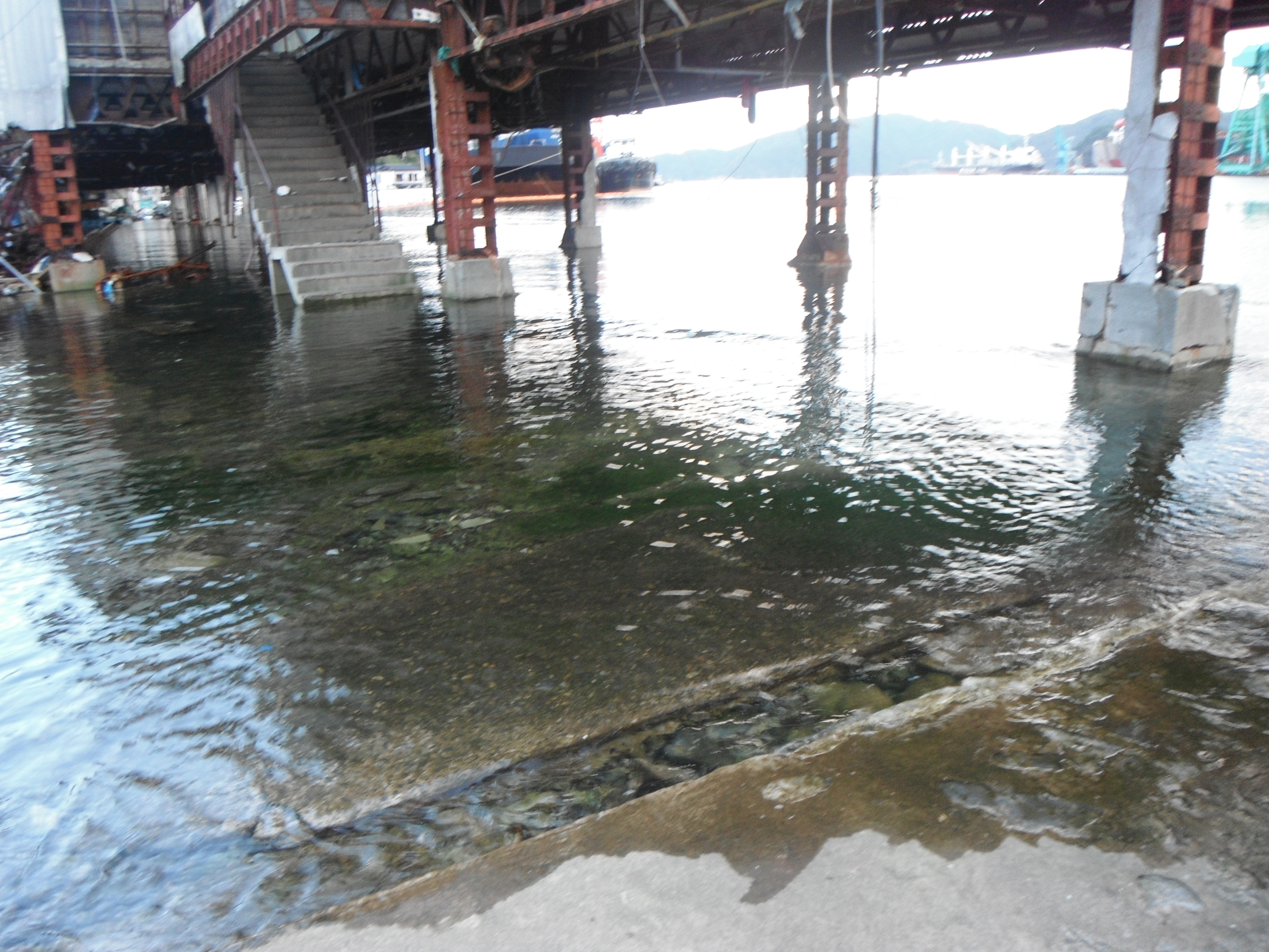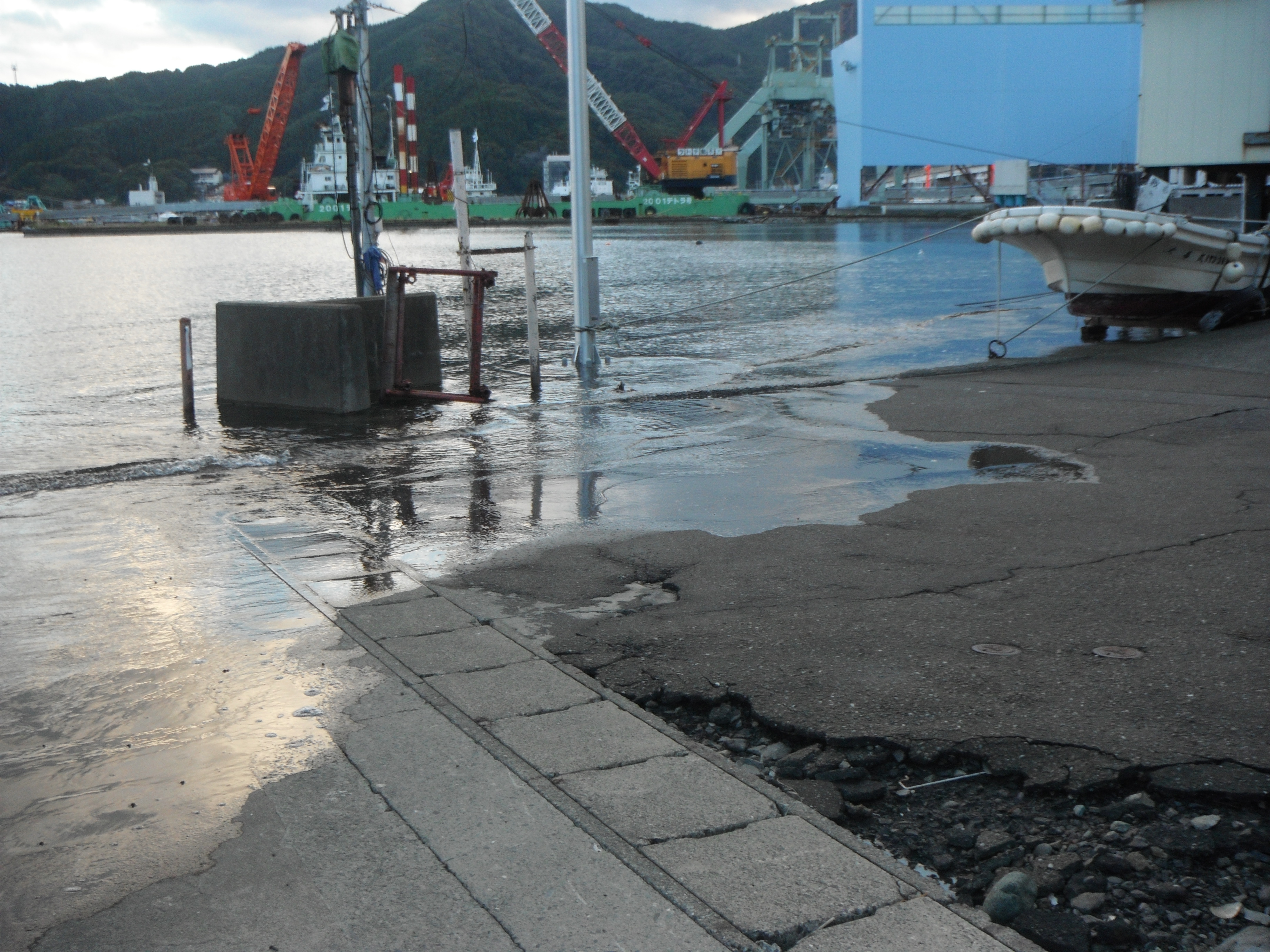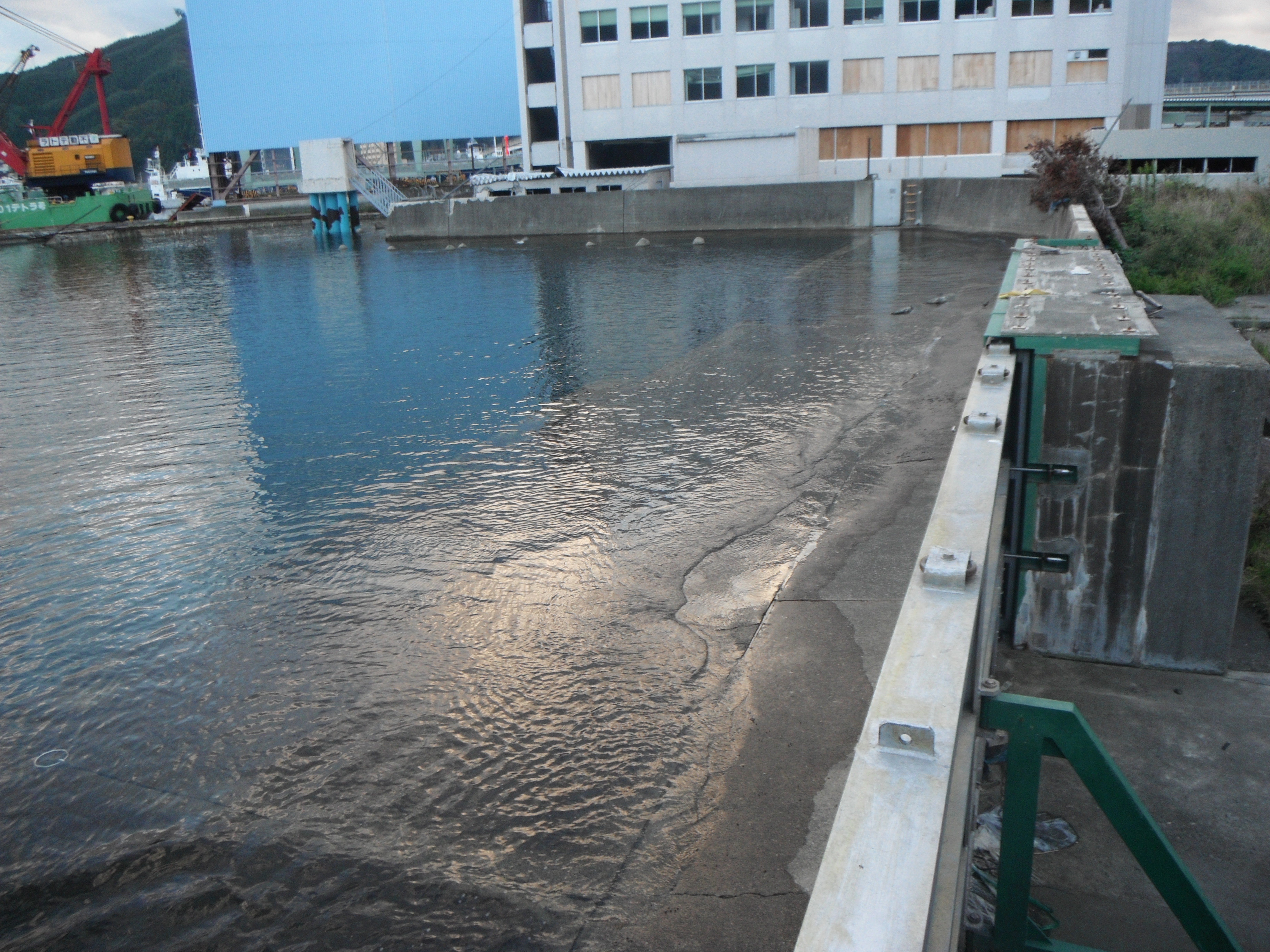 高潮により冠水した魚河岸と漁協の写真(午後4時半頃)