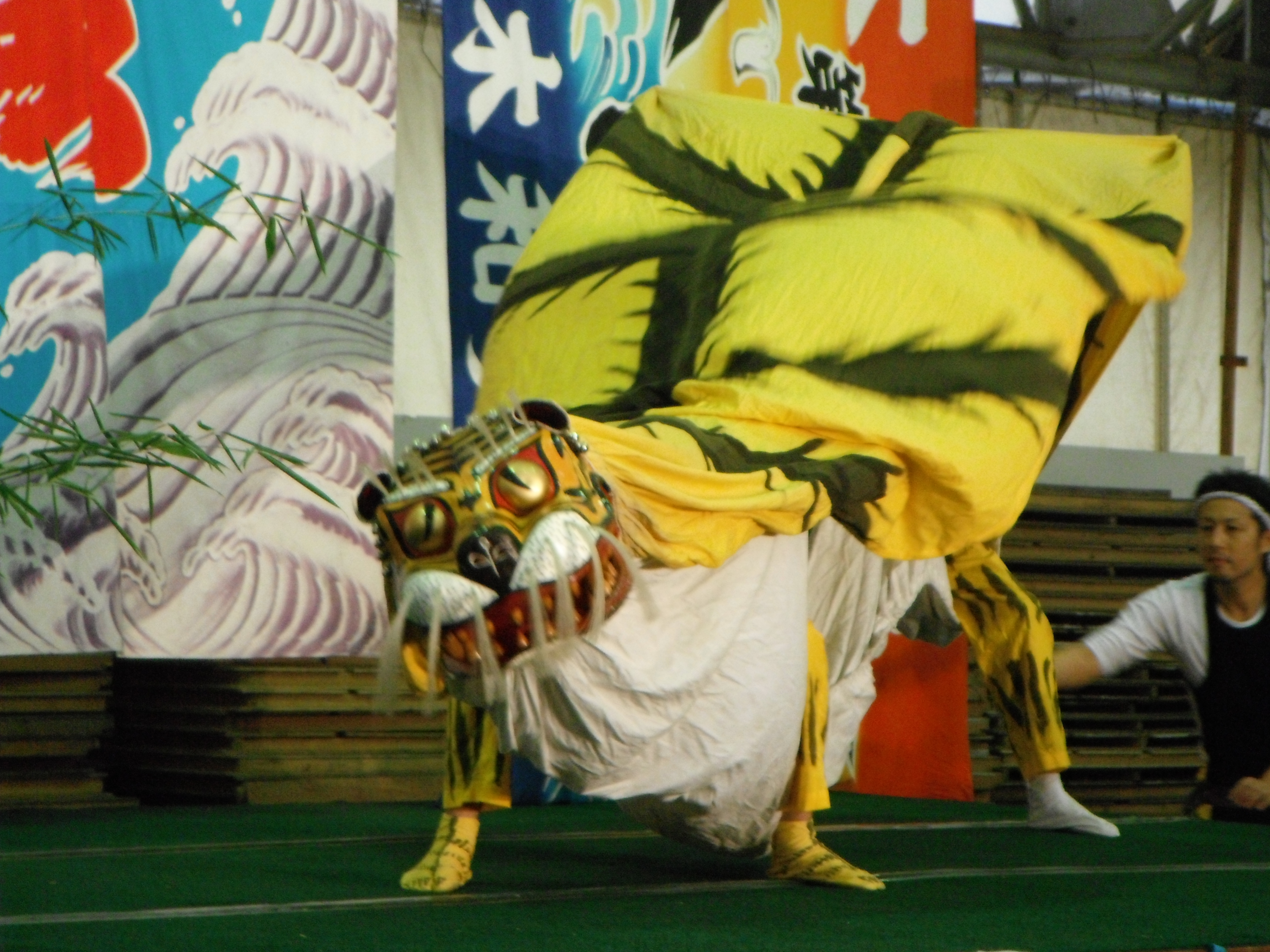 眠りから覚めた二頭の獅子が、跳ね、走り、絡み合いながらまいます。黄色、萌黄色に彩られた色鮮やかな獅子が跳ね狂う様は、豪快なうちにもどこか愛らしく、勇壮なテンポの音楽に乗って清列の気が充満していきます。