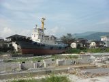 民家の前に大きな船が流れ着いていました。