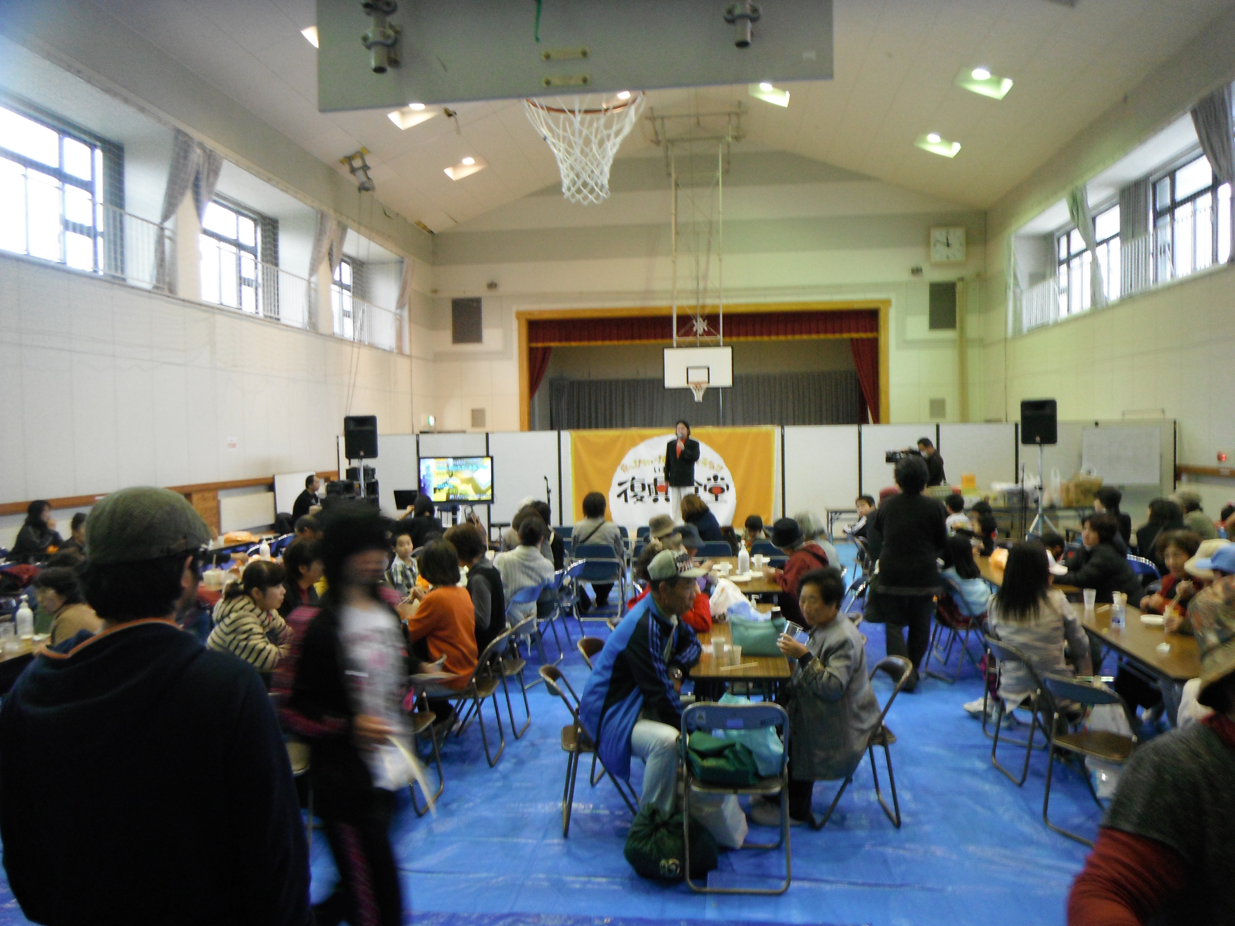 食べて!! 飲んで! しゃべって! みんな元気!!がテーマのこの催しは、そのテーマ通り、炊き出しや日本酒の振る舞い、洋服などの物資配布、じゃんけん大会やものまねショーなど楽しさ盛りだくさんの内容でした。