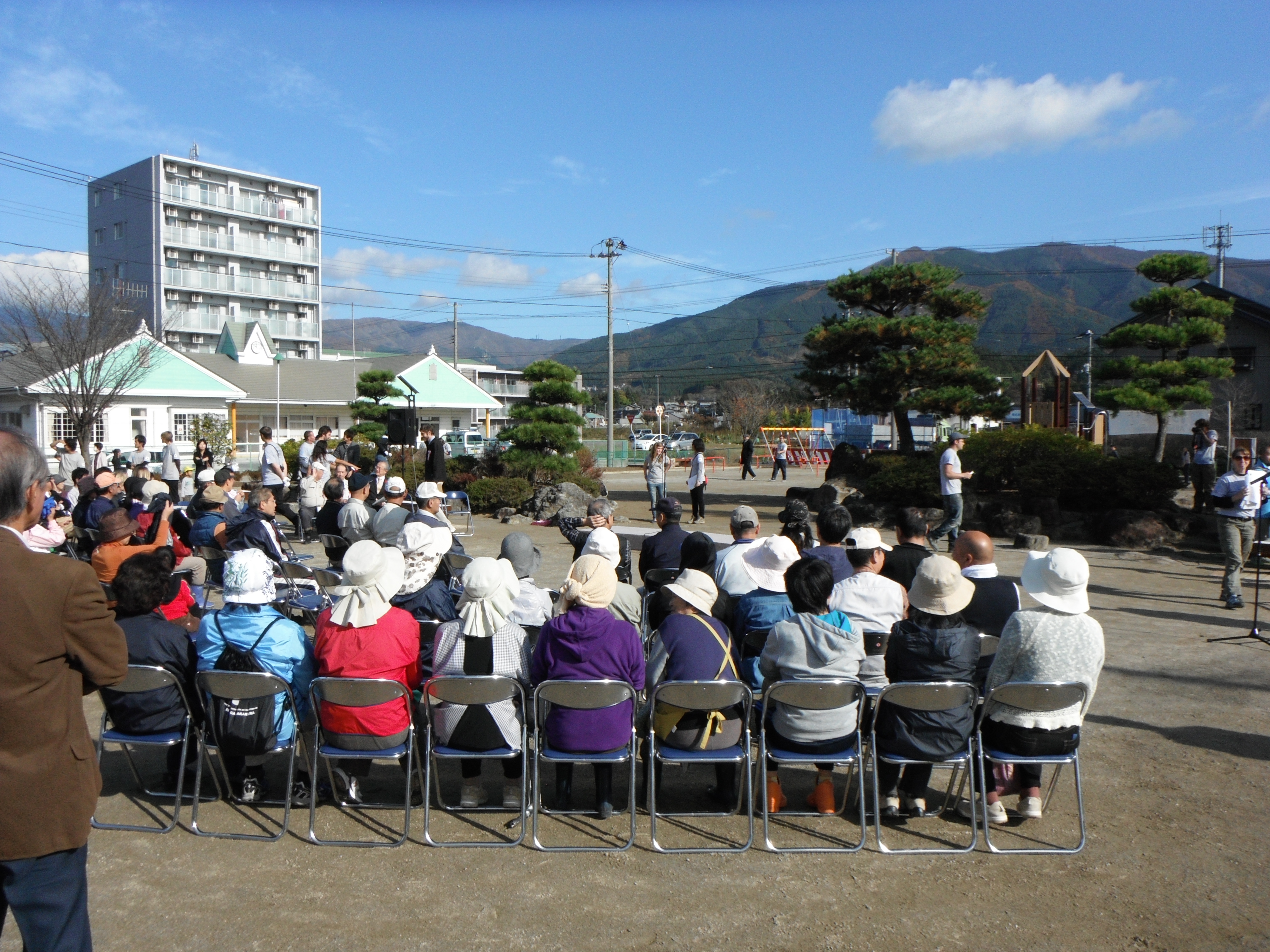 子供たちはきれいに整備された公園でオールハンズメンバーと綱引きや鬼ごっこなどで元気いっぱいに遊んだり、お世話になった地域の方々は感謝の気持ちとさようならを伝えていました。