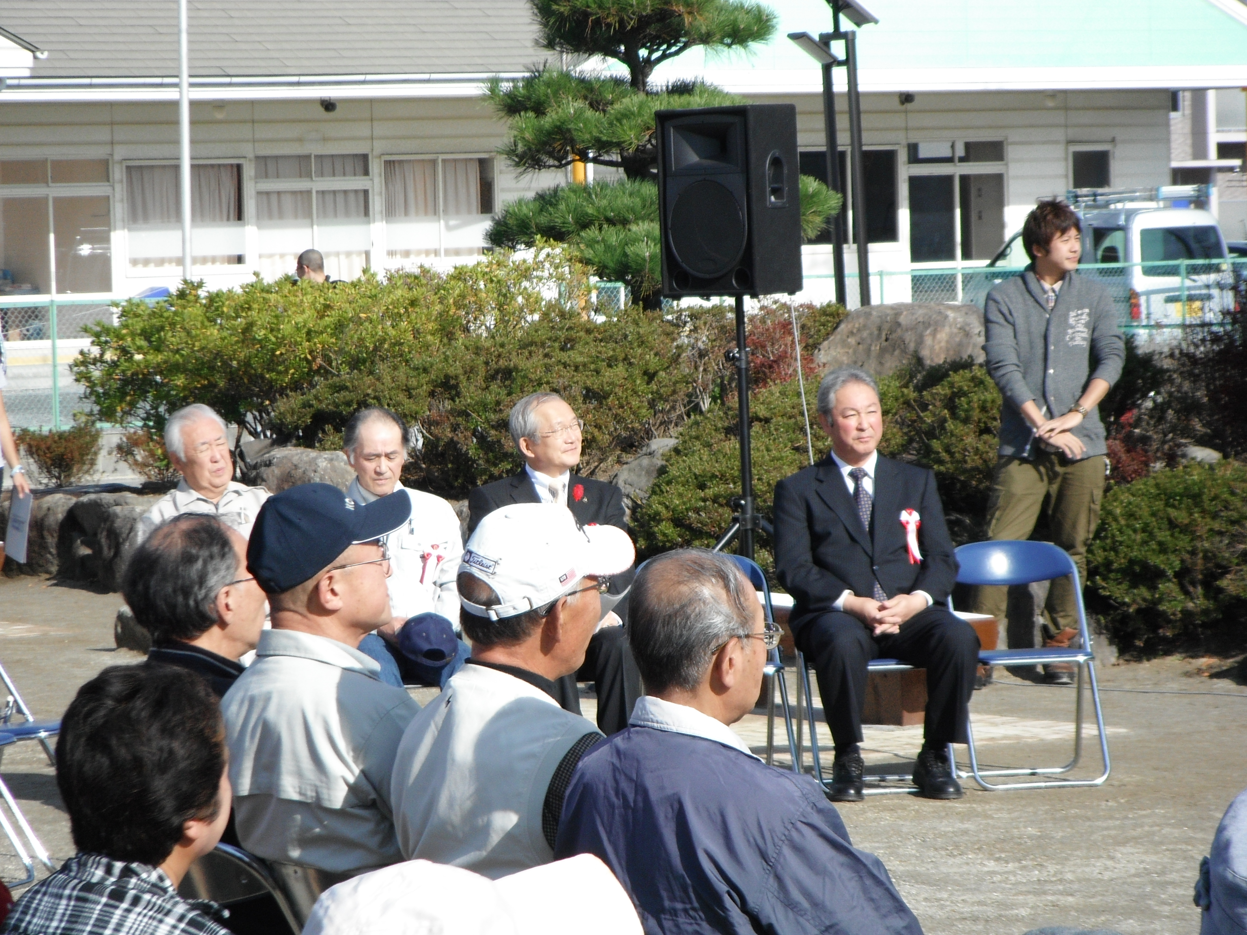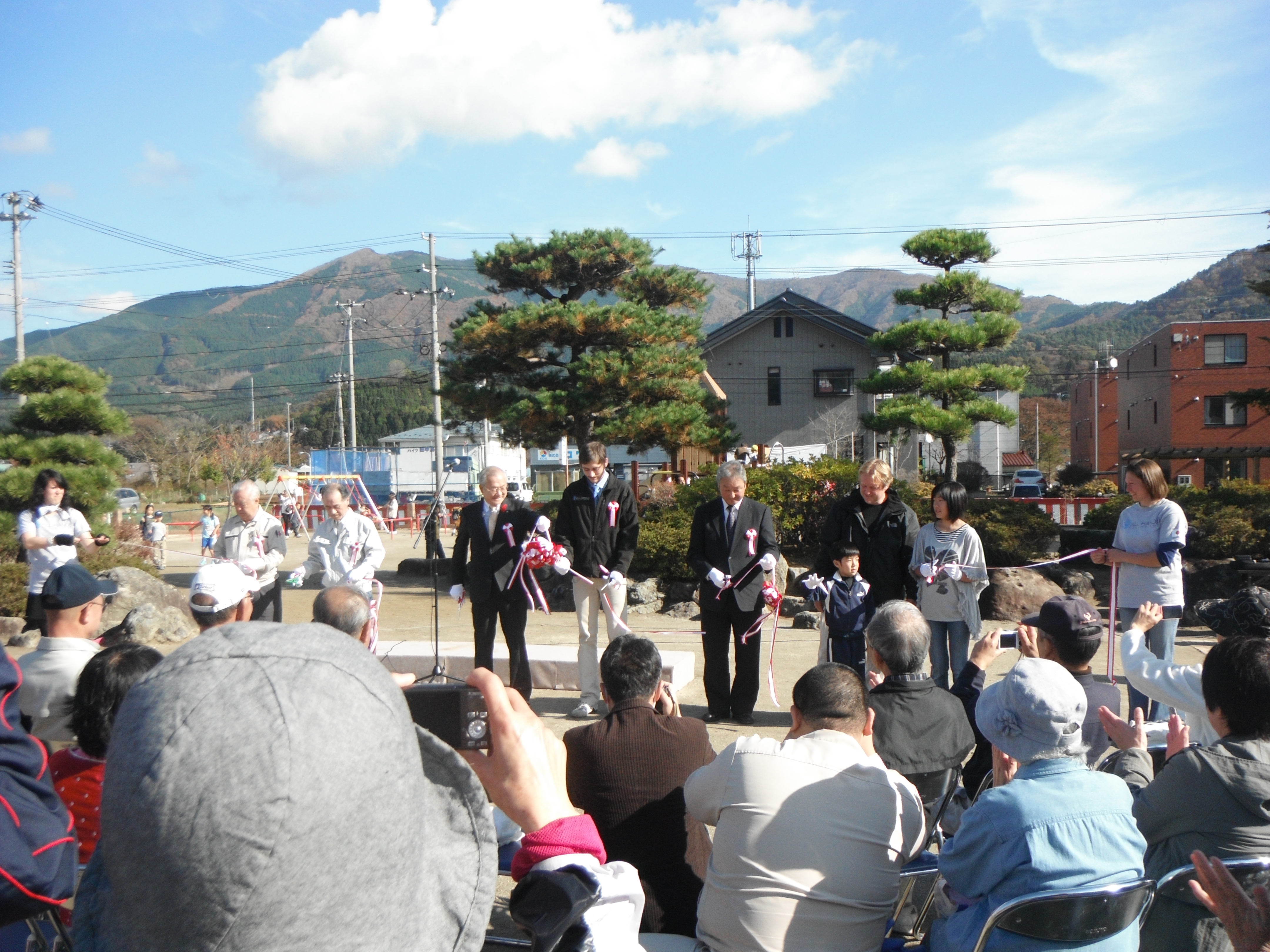 式は、オールハンズボランティアプロジェクト東北のクリス・ターナー代表のあいさつ、応じて戸田市長が感謝のあいさつ、続いて公園整備のリーダーを務めたクリス・ザネラ氏のあいさつ、という流れで進んでいきました。