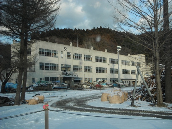 震災直後から瓦礫置き場になっている、大船渡市立赤崎中学校。
