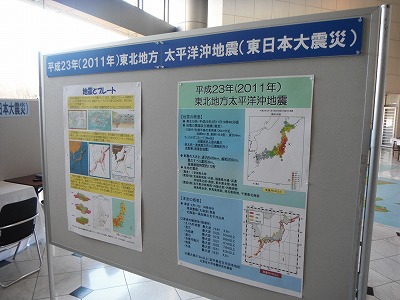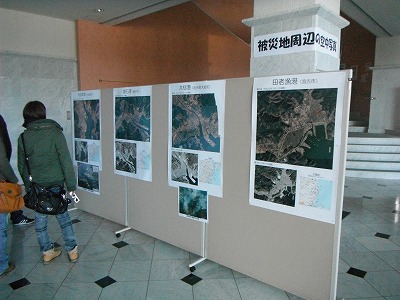 東日本大地震に関する展示では、地元である大船渡市などの被災前と後の空中写真、浸水範囲の概況・土地利用などの展示などもあった。