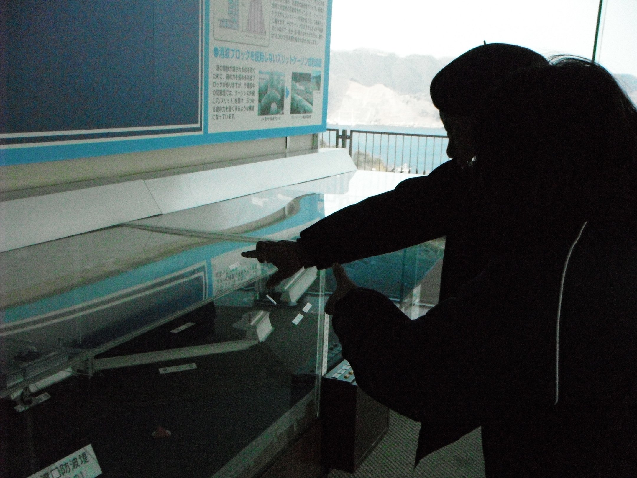 次は11:00から、元・平田町内会会長様にお話をお聞きしました。ご自身も被災しており、ご自宅があった跡地での撮影となりました。当時避難した鉄の歴史館にもご案内していただき、湾港防波堤の模型を前に説明していただきました。