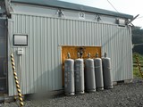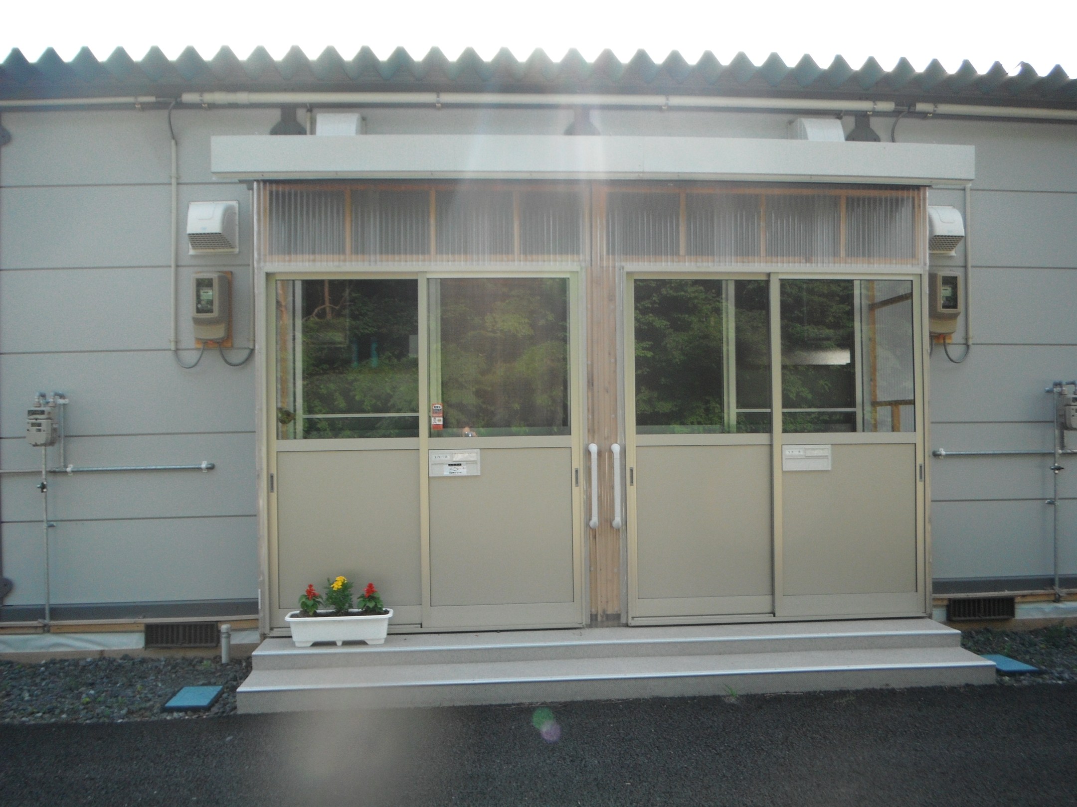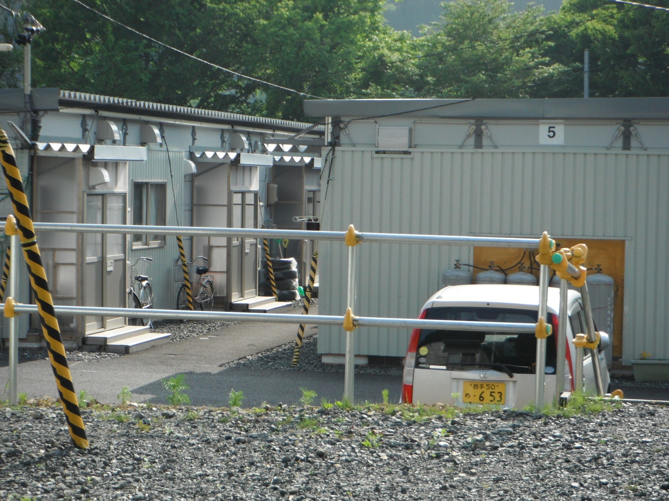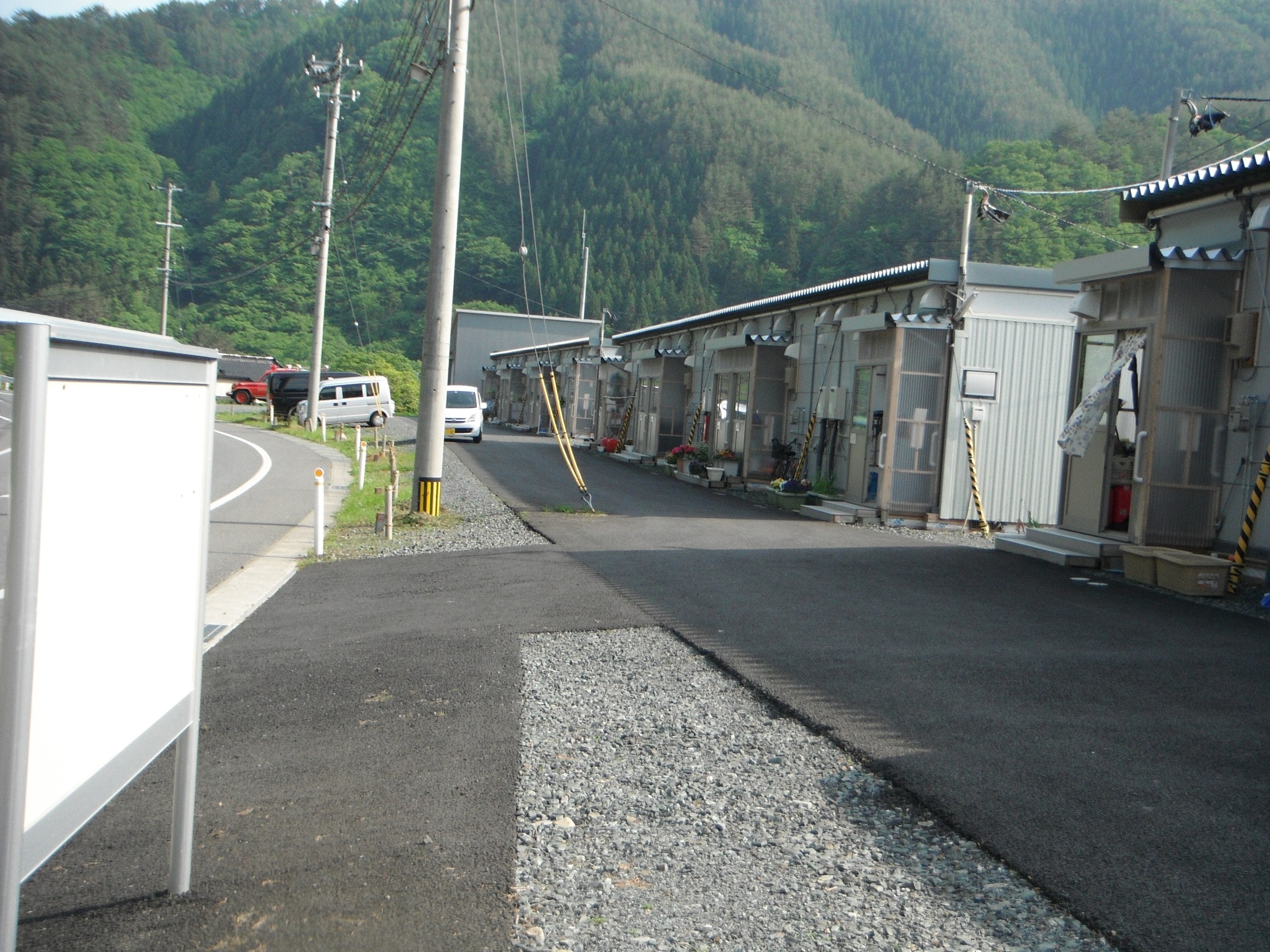 ▾第1仮設を斜めから撮影。道路沿い▾前から。仮設の前はコンクリになっています。右と左の入口が近くなっています。