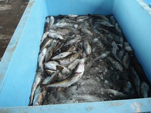 唐丹港で水揚げされた定置網漁の漁獲を、魚市場まで運んできたそうです。