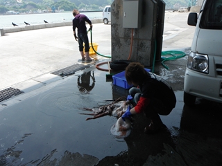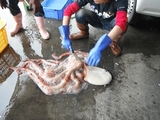 みずダコをさばいてぶつ切りにしている所です。 市内の居酒屋、飲み屋さんに調理し易くさばいていました。