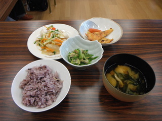 ↑ご飯には古代米と塩分控えめな ↑皆でいただきますをして食べました。