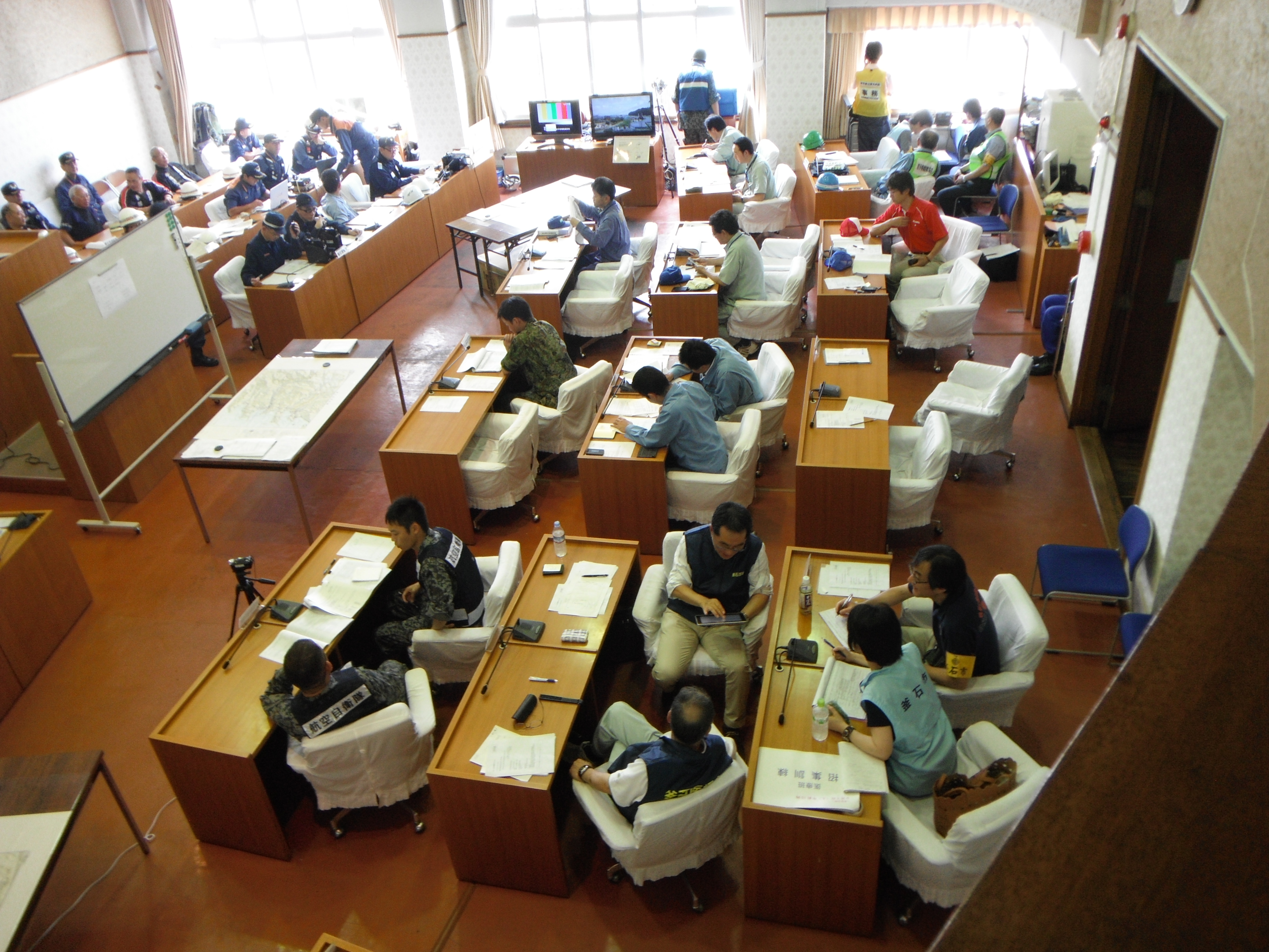 11時00分からは震災後1週間後の設定に変わり行方不明者の人命救助活動、道路交通の確保、各避難所との連絡等々、3グループに分かれて各機関の連絡、作業の在り方等を集中的にまとめていました。