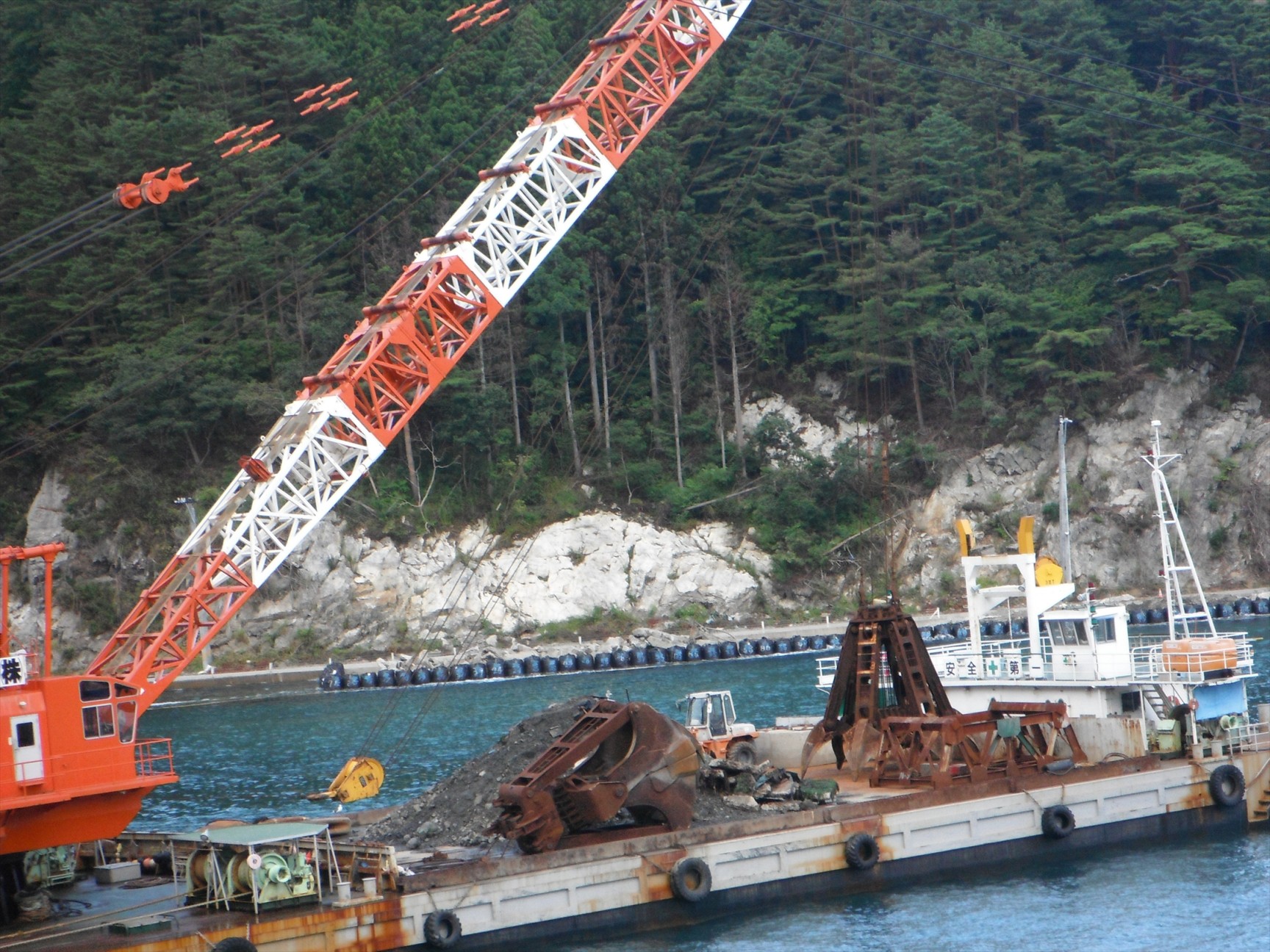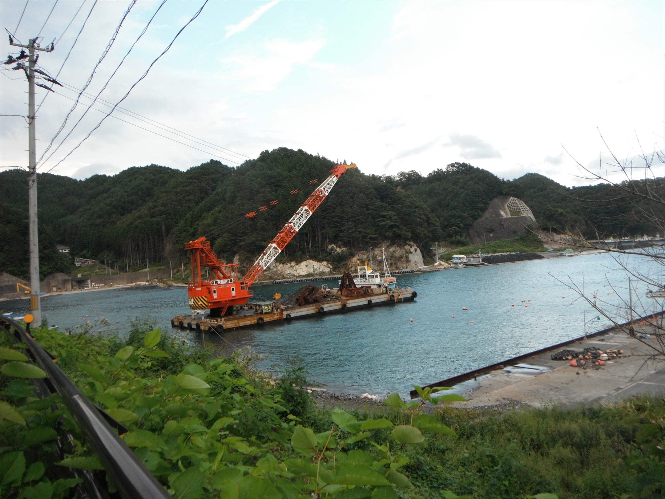 通りがかりに、両石の港に重機が浮かんでいるのを見ました。