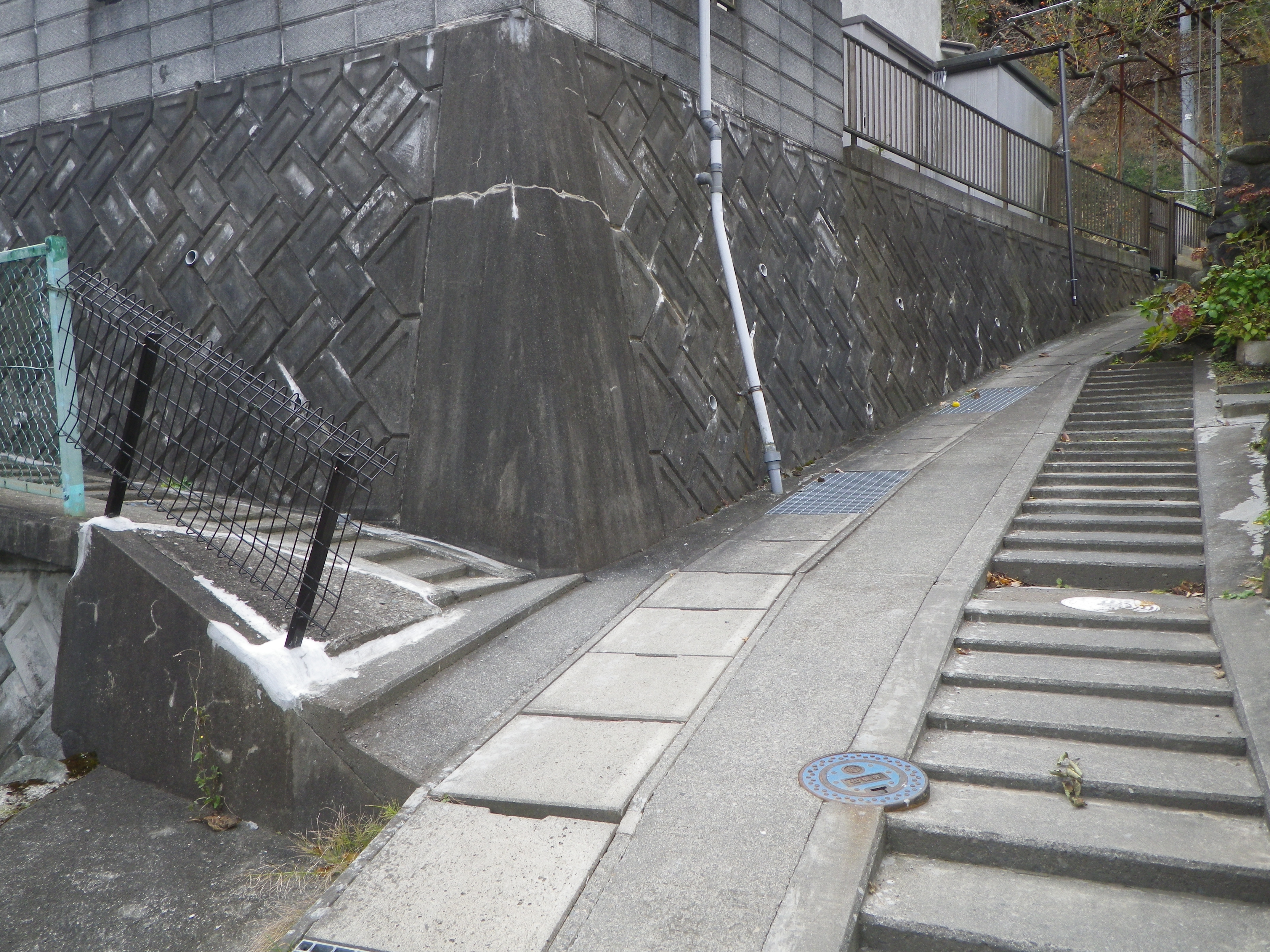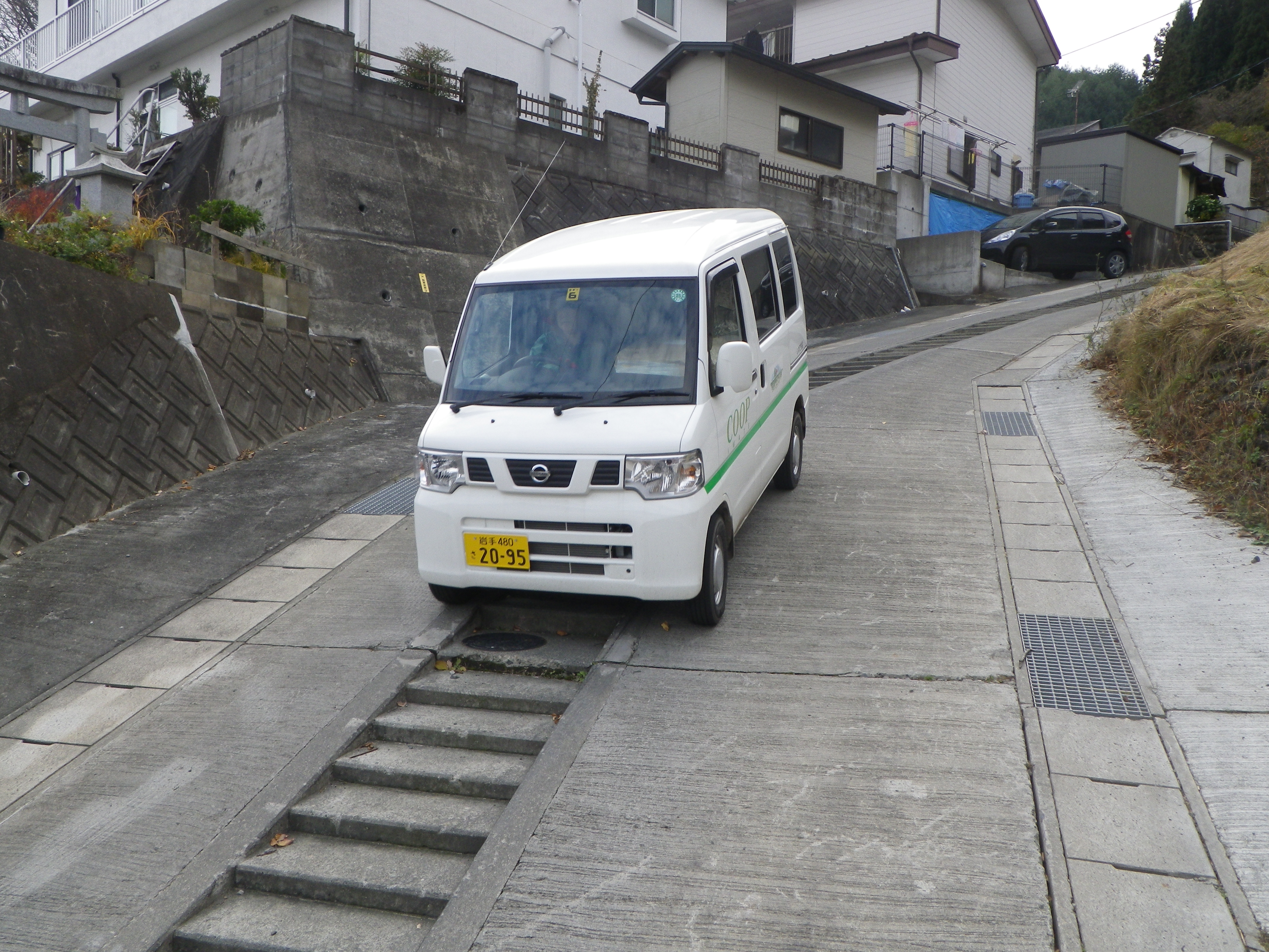急な車道で軽自動車も大変です。(真ん中の階段が歩行者用です。)