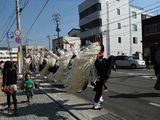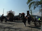 ▼東前の道路には、御神輿さまを待つ、神楽や虎舞が待機しています。