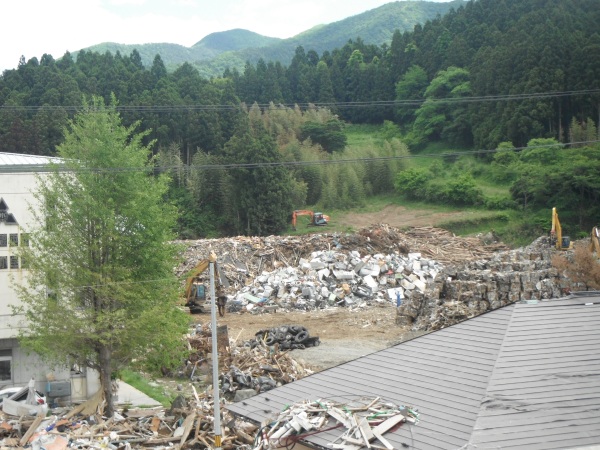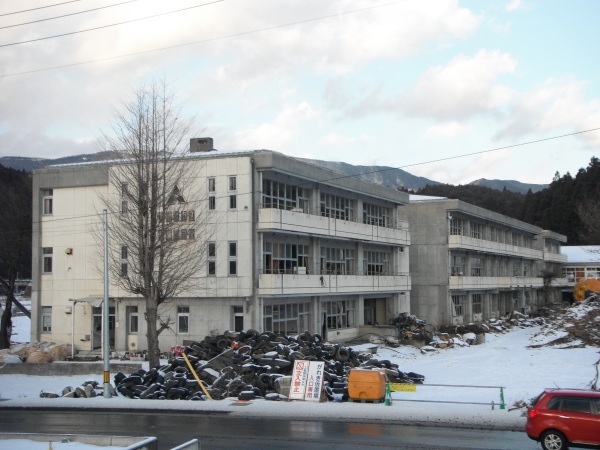 震災直後から瓦礫置き場になっている、大船渡市立赤崎小学校・中学校。